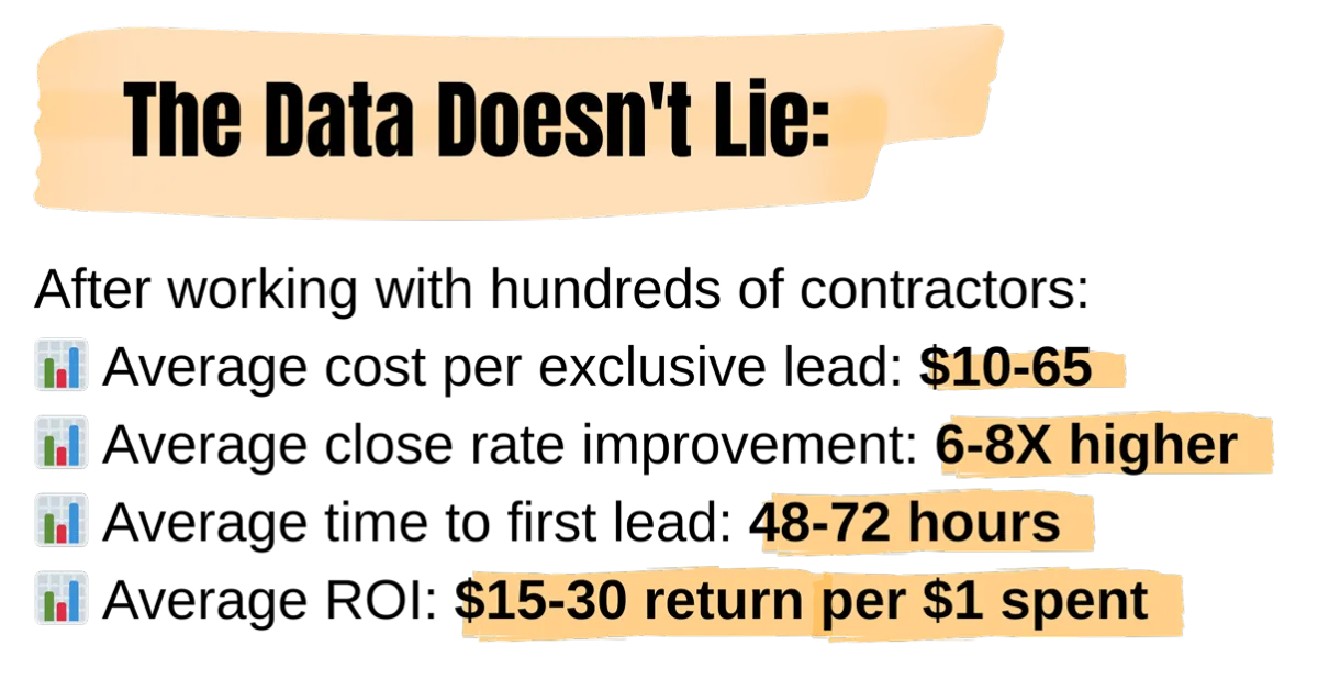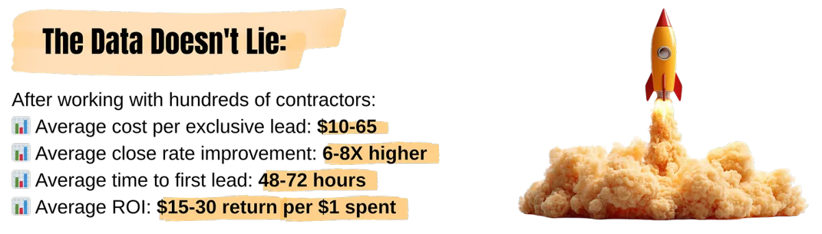 Most contractors see their first lead within 48-72 hours of launching their campaign. Within 2 weeks, you should have a consistent flow of exclusive leads.